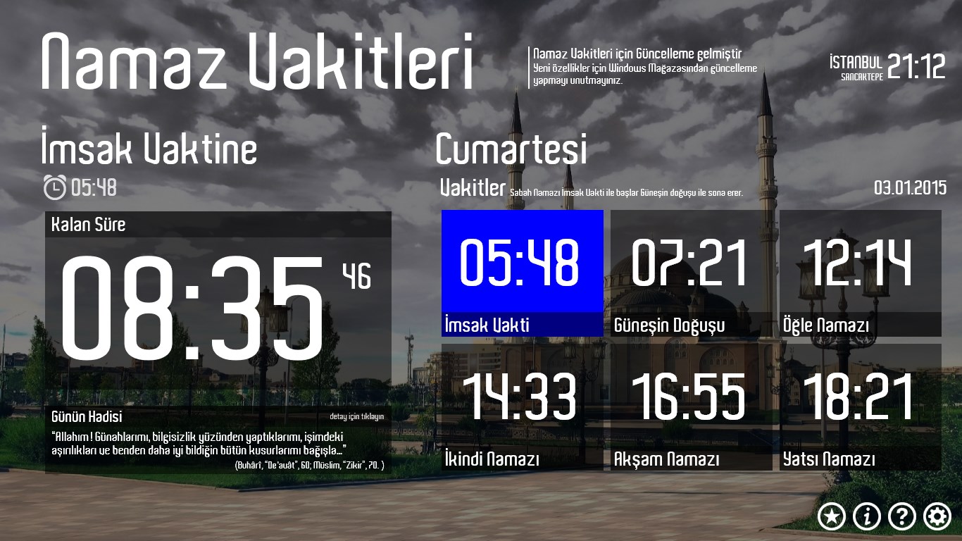 Sonraki makale bus driver türkçe yama. Namaz vakitleri programı 1 9 indir namaz vakitleri hep masaüstünüzde olsun. Namaz vakitlerinde ezan ı şerif ile namaza hazırlanın namaz vakitlerini hesaplayacağınız k. Miladi tarih i̇msak güneş öğle i̇kindi akşam yatsı.