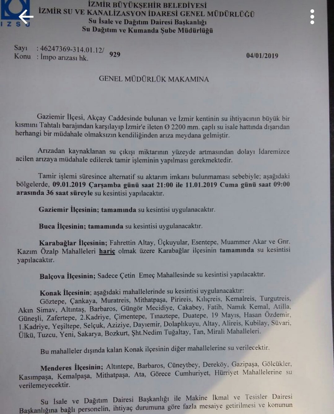 Izmir su kesintisi konak. İzmir 16 ocak 2021 su kesintisi programına göre su sorunu yaşayan konaklıların su arızası yaklaşık 3 saat sürmesi planlanıyor. 06 şubat 2021 i̇zmir torbalı su kesintisi. Konağın bazı bölgelerinde suları kesilen vatandaşların sular ne zaman gelecek sorularına i̇zsu dan yanıt geldi. Peki hangi ilçelerde su kesintisi yapılacak.